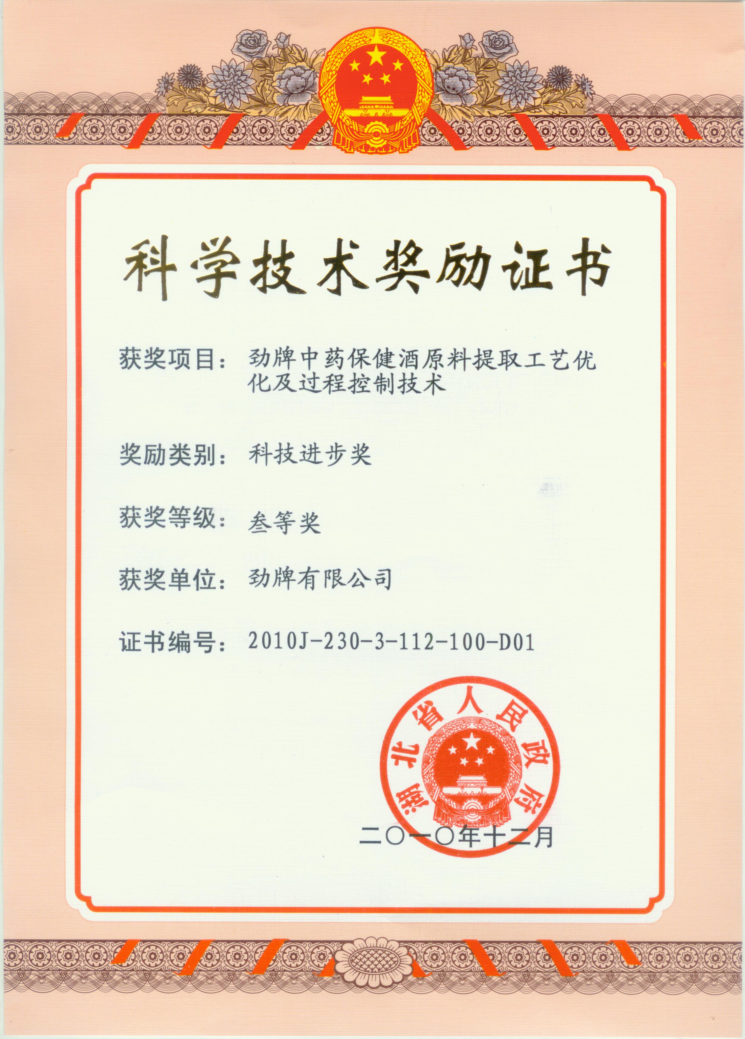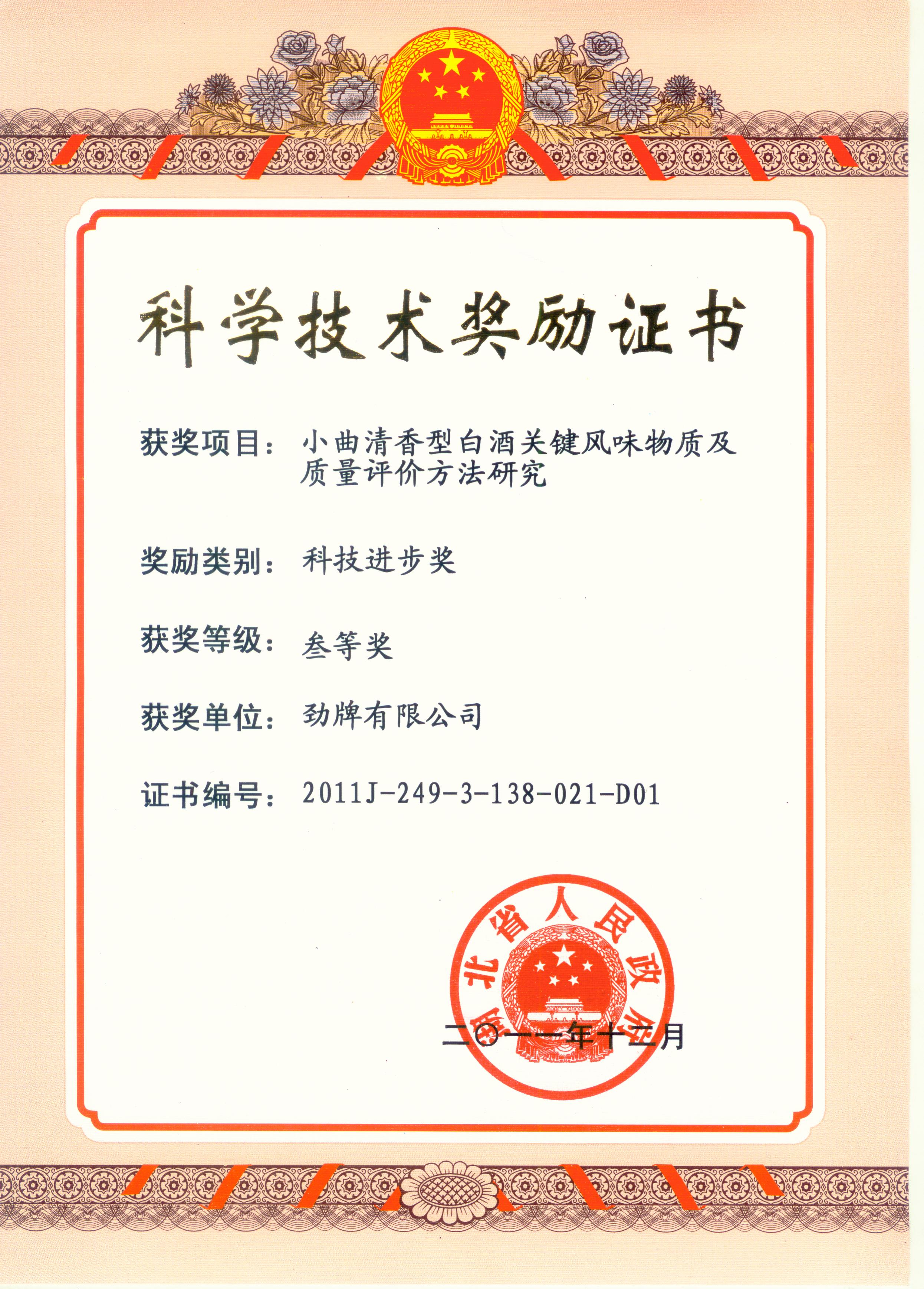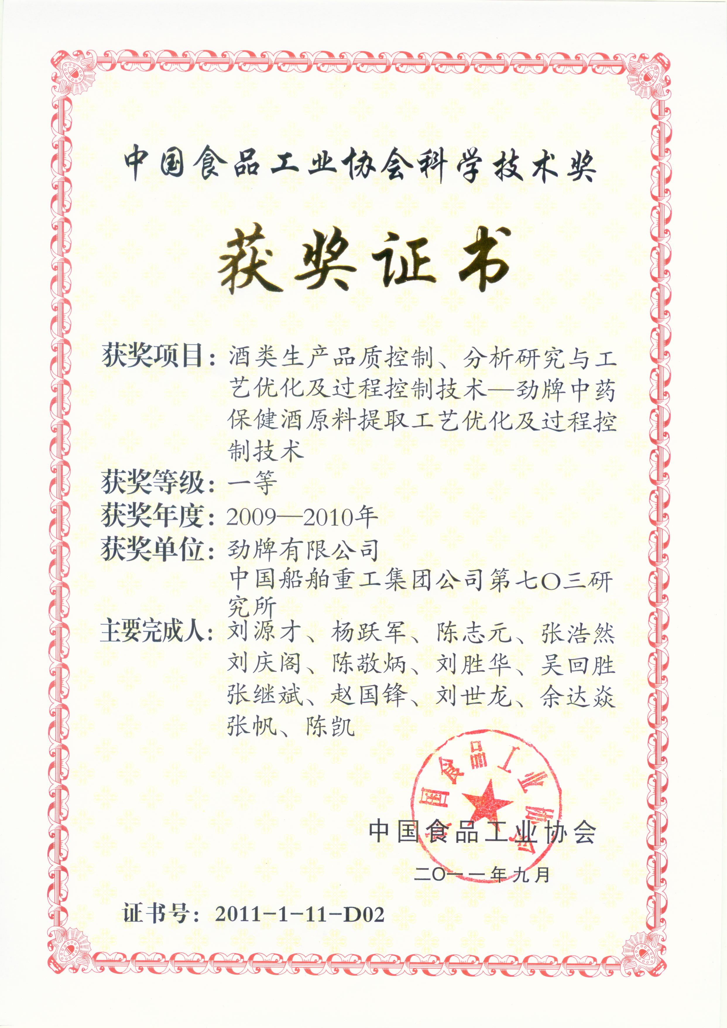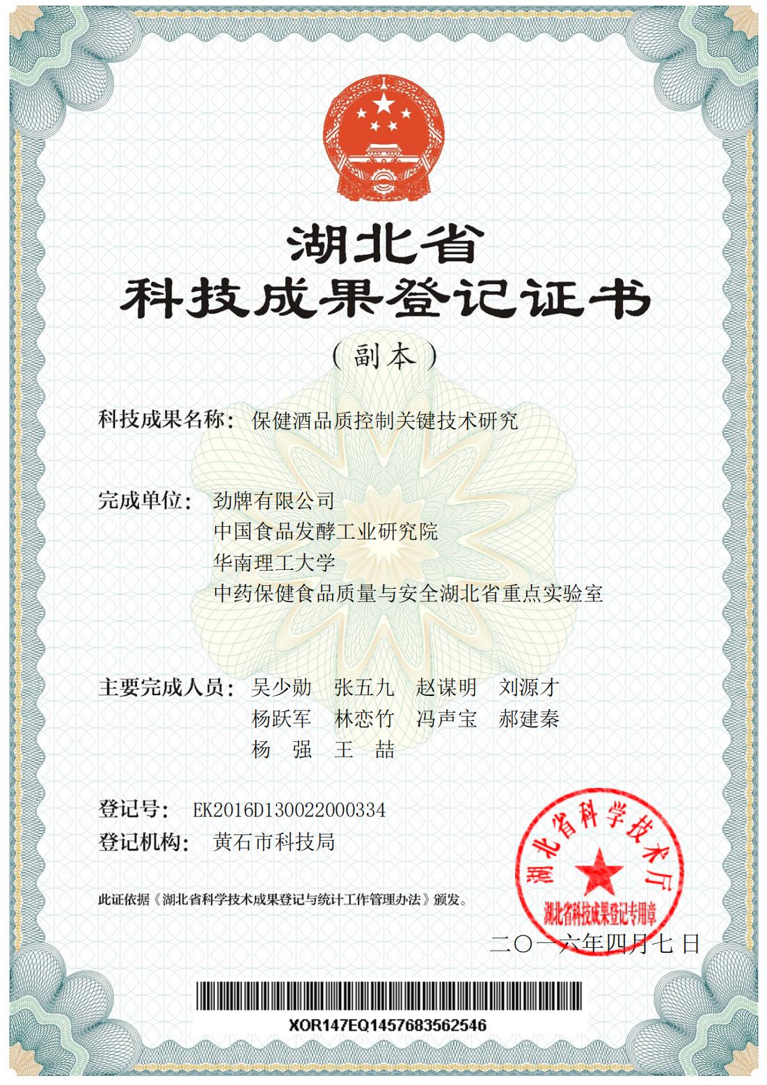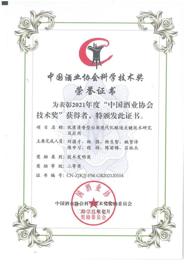 目前勁牌有限公司共獲得國(guó)家級(jí)、省級(jí)、行業(yè)級(jí)科技獎(jiǎng)勵(lì)27項(xiàng)。其中國(guó)家級(jí)科技獎(jiǎng)1項(xiàng),省部級(jí)科技獎(jiǎng)11項(xiàng),行業(yè)級(jí)科技獎(jiǎng)15項(xiàng)。