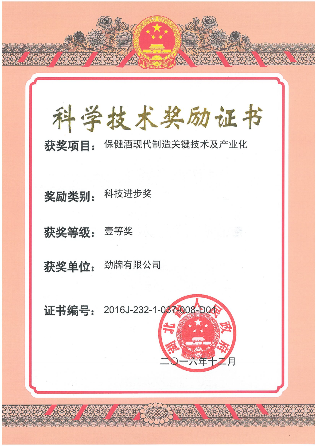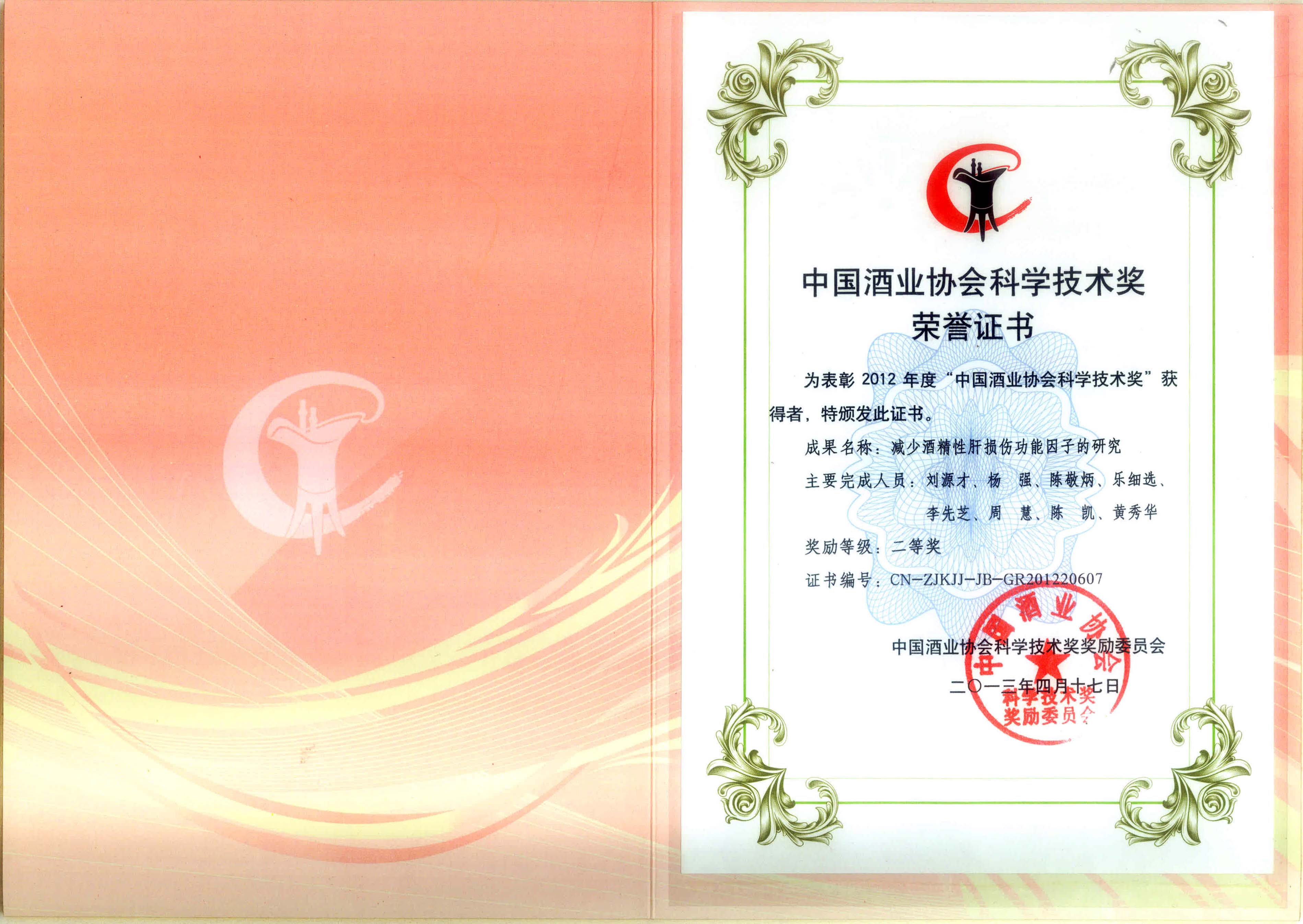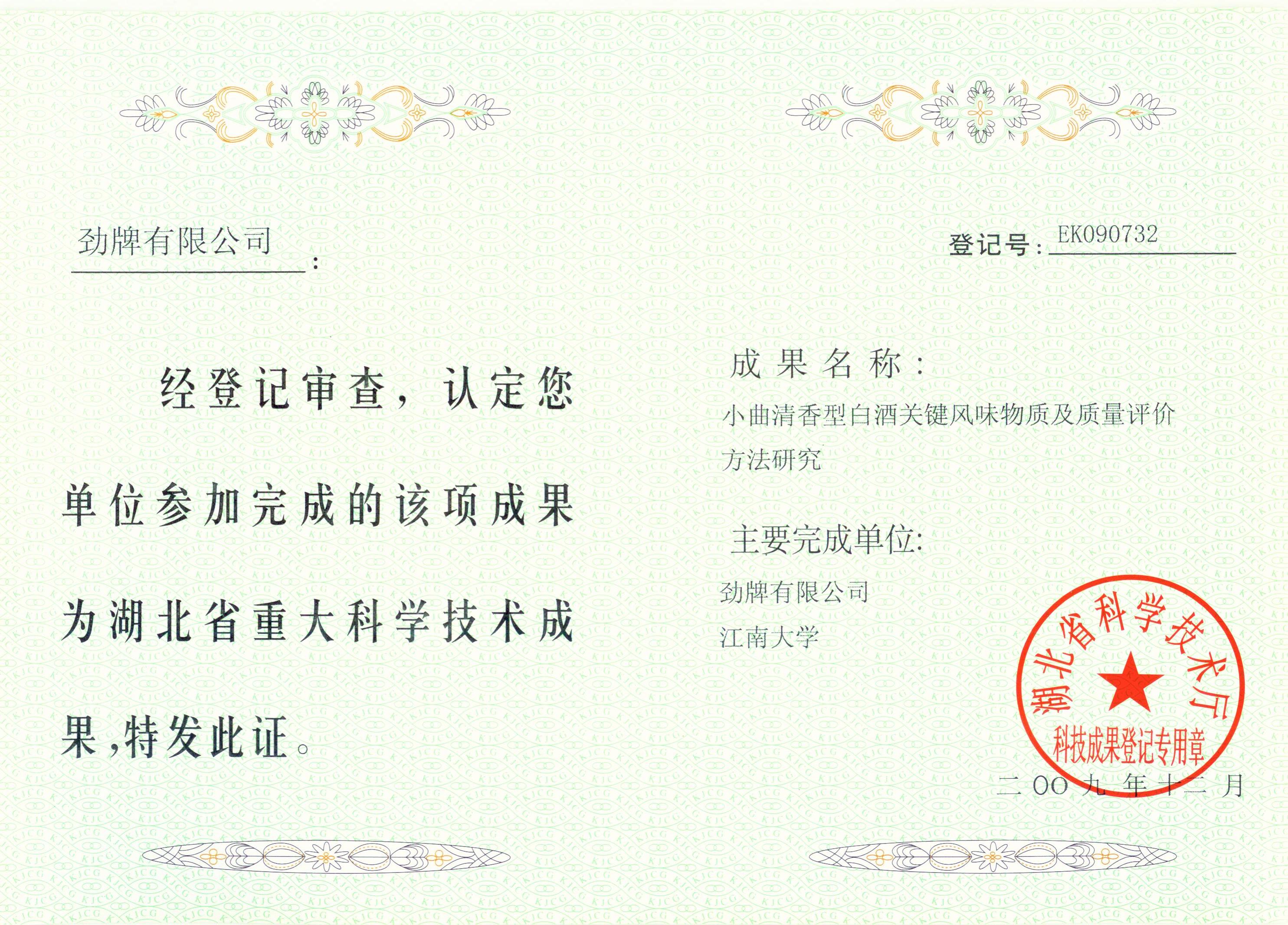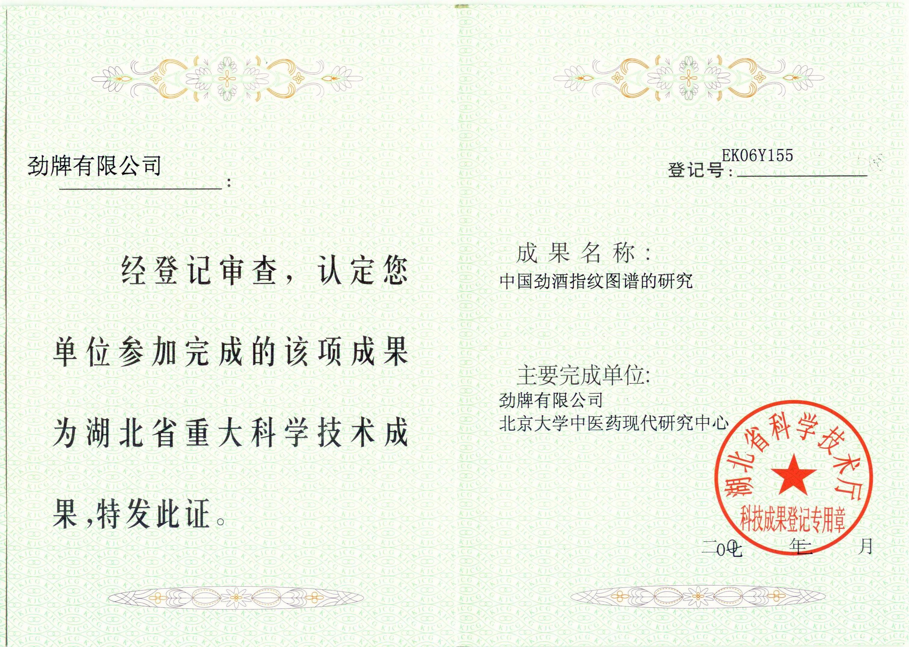 目前勁牌有限公司共獲得國(guó)家級(jí)、省級(jí)、行業(yè)級(jí)科技獎(jiǎng)勵(lì)27項(xiàng)。其中國(guó)家級(jí)科技獎(jiǎng)1項(xiàng),省部級(jí)科技獎(jiǎng)11項(xiàng),行業(yè)級(jí)科技獎(jiǎng)15項(xiàng)。