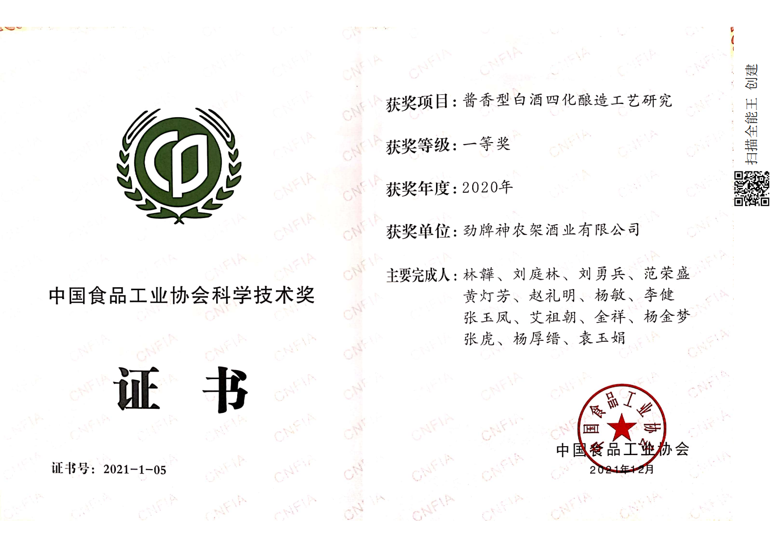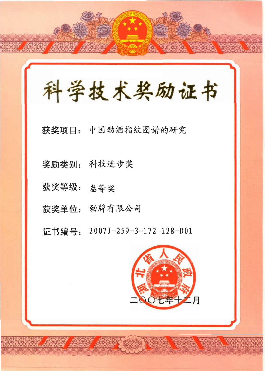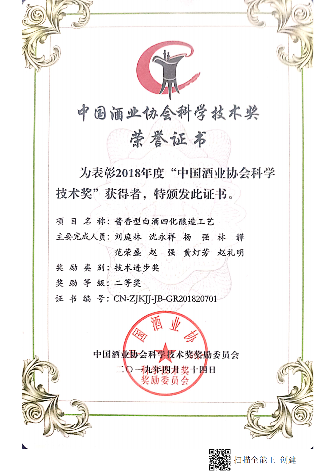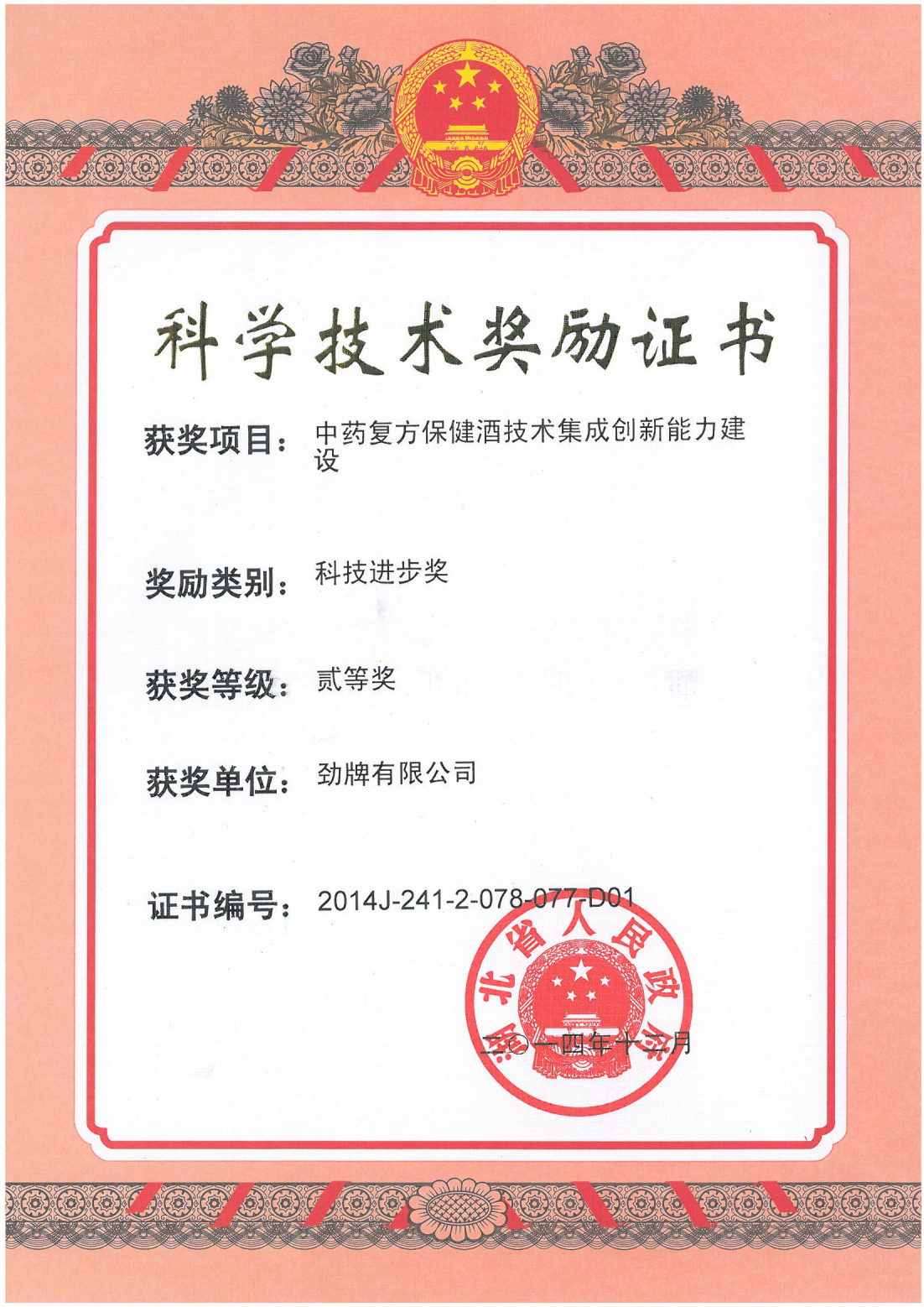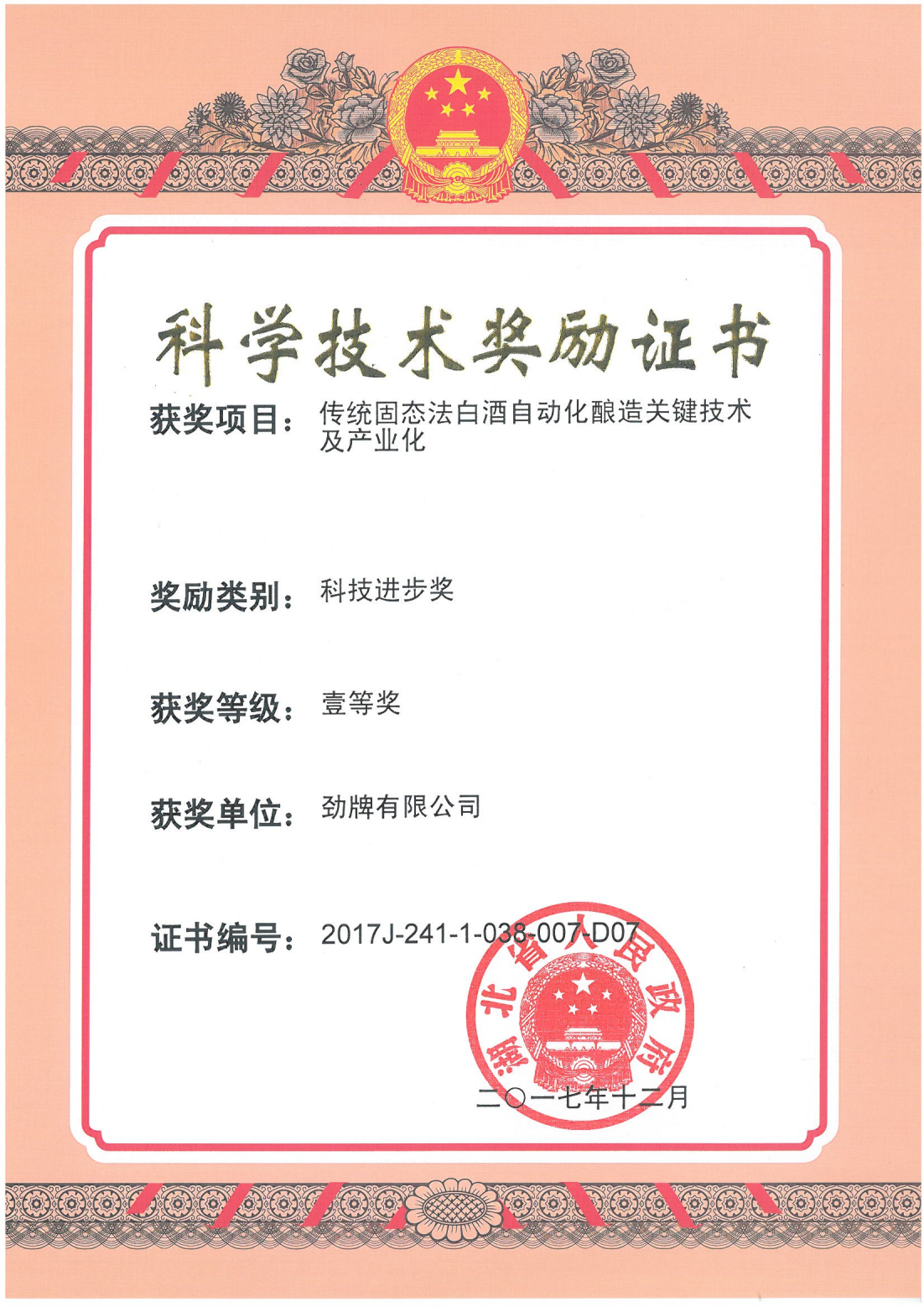 目前勁牌有限公司共獲得國(guó)家級(jí)、省級(jí)、行業(yè)級(jí)科技獎(jiǎng)勵(lì)27項(xiàng)。其中國(guó)家級(jí)科技獎(jiǎng)1項(xiàng),省部級(jí)科技獎(jiǎng)11項(xiàng),行業(yè)級(jí)科技獎(jiǎng)15項(xiàng)。